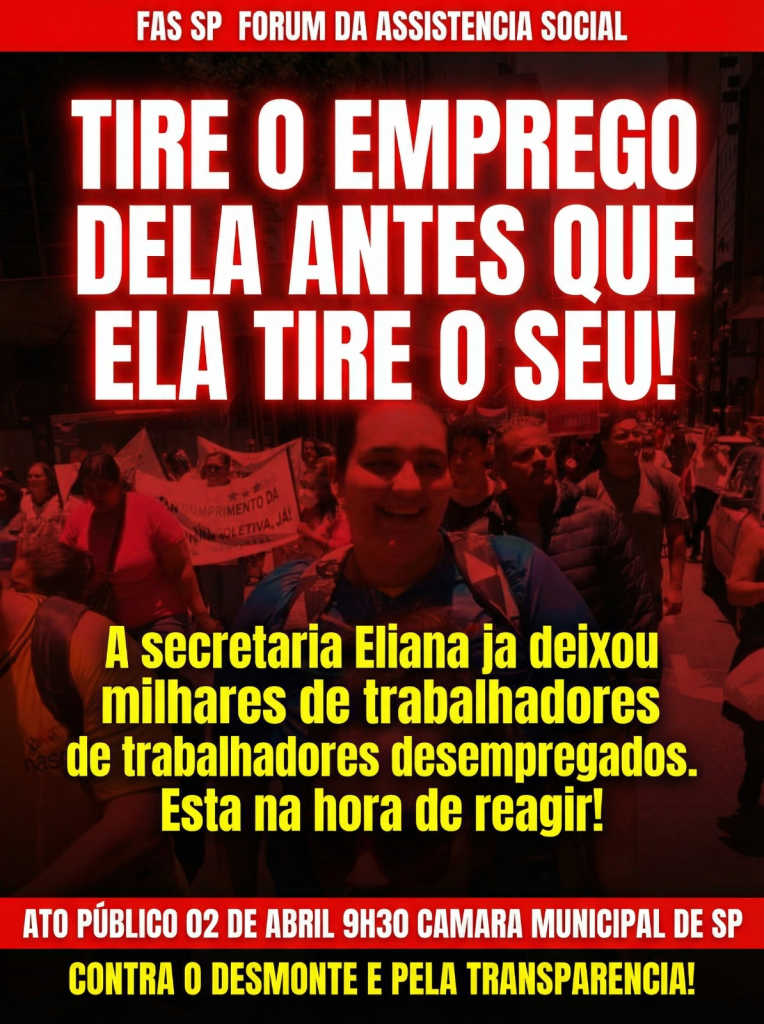 O Fórum da Assistência Social de São Paulo convocou uma mobilização para o próximo dia 02 de abril, na Câmara Municipal de São Paulo, reunindo trabalhadores, organizações da sociedade civil e usuários do Sistema Único de Assistência Social (SUAS).