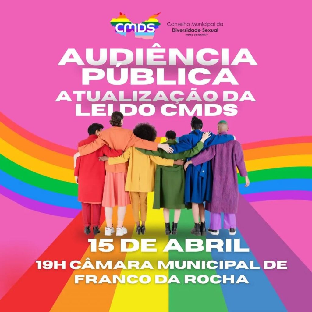 O Conselho Municipal da Diversidade Sexual (CMDS) convida a população para participar da Audiência Pública que vai debater a atualização da Lei Municipal nº 1.637/2022, que estrutura o conselho no município de Franco da Rocha.