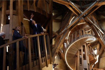 Macron sobe ao topo de Notre Dame e inaugura torres restauradas com escada de 400 degraus inspirada em Da Vinci