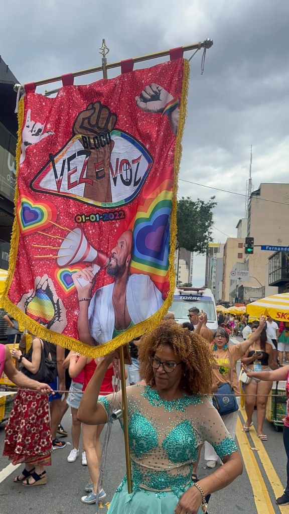 - Beatriz Dias, porta-estandarte do Bloco Vez e Voz, conduziu o símbolo maior da identidade coletiva.