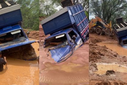 Caminhonete atola e acaba soterrada por lama durante chuva de 100 mm…