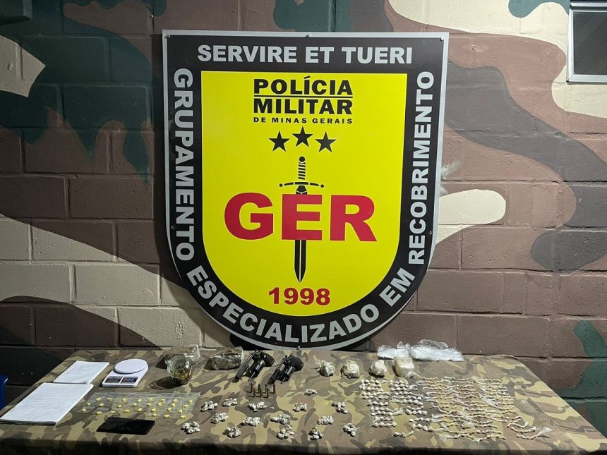 No local, foram encontradas duas armas de fogo. Uma delas foi furtada de um bombeiro militar. Também havia munições, mais de 400 porções de drogas e outros materiais.