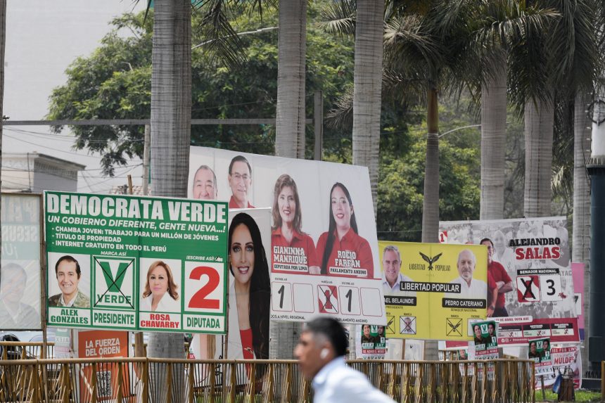 Publicidade política em Lima no Peru no dia 8 de abril de 2026; país vai às urnas neste domingo (12) escolher o candidato presidencial