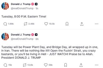 “Terça-feira será o Dia das Usinas de Energia e o Dia das Pontes, tudo em um só, no Irã. Não haverá nada igual!!! Abram a p*** do estreito, seus bastardos loucos, ou vocês vão viver no inferno — é só esperar! Louvado seja Alá”, escreveu no Truth Social.