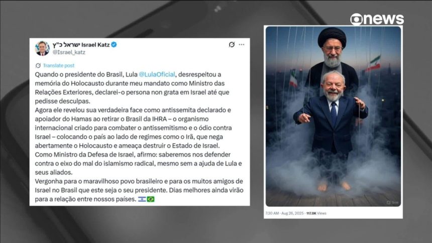Nesta terça-feira (26) Katz chamou Lula de antissemita “apoiador do [grupo terrorista] Hamas” e o associou ao líder supremo do Irã, o aiatolá Ali Khamenei.