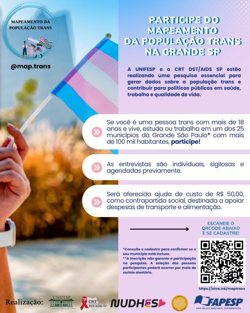 É nesse contexto que uma iniciativa coordenada pela Universidade Federal de São Paulo (Unifesp) e pelo CRT DST/AIDS SP está realizando o Mapeamento da População Trans na Grande São Paulo, uma pesquisa que busca compreender as condições de vida dessa população e contribuir diretamente para a construção de políticas públicas mais eficazes.