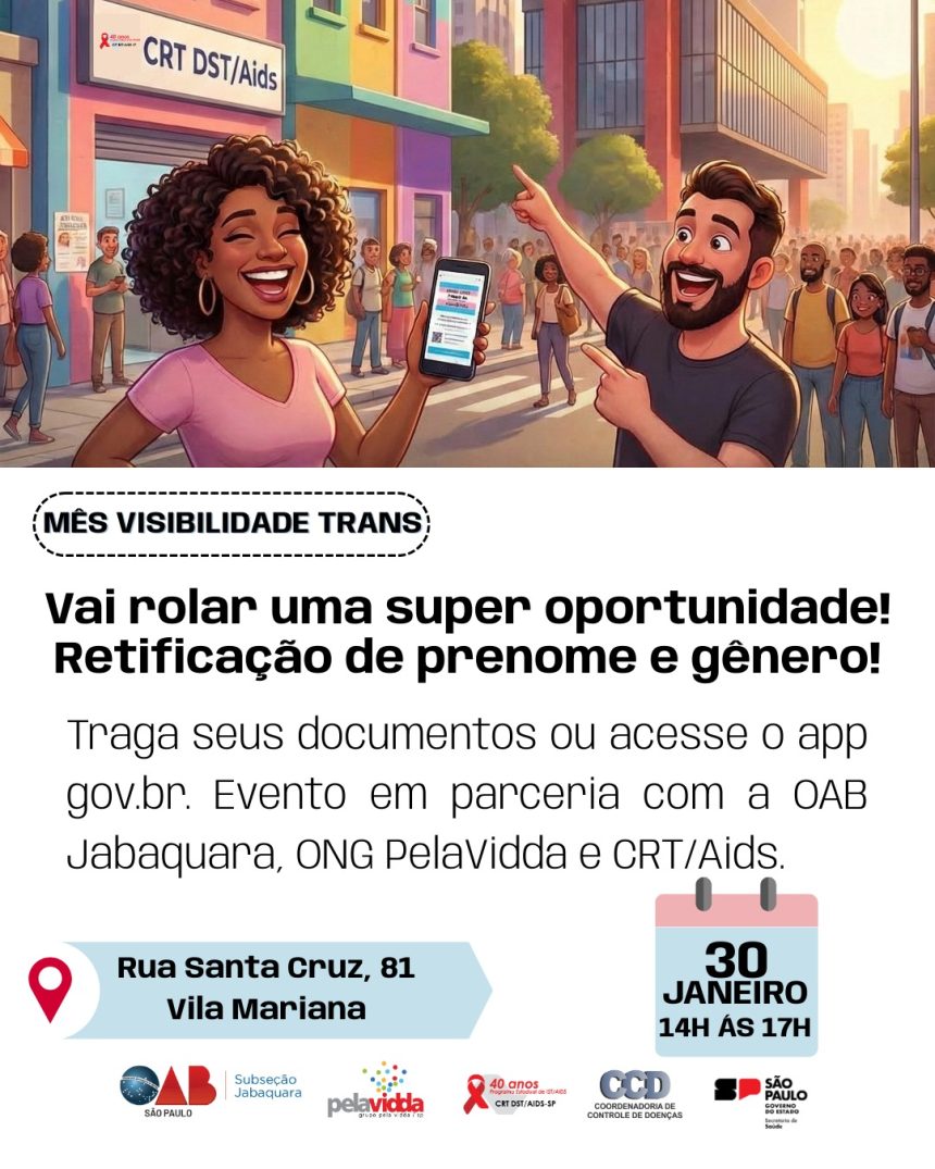 A Comissão da Diversidade Sexual e de Gênero da OAB Jabaquara e Saúde, em parceria com a ONG PelaVidda e o Centro de Referência Treinamento DST/Aids de São Paulo realizam mutirão para retificação de prenome e gênero voltado a pessoas trans, travestis e não binárias.