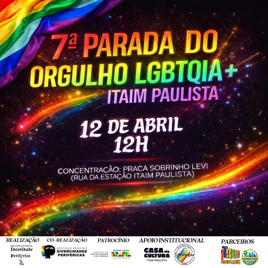 No dia 12 de abril, a partir das 12h, a Praça Sobrinho Levi, no Itaim Paulista será a concentração, da 7ª Parada do Orgulho LGBTQIA+ do Itaim Pta. Gratuito e aberto ao público, o evento reafirma o protagonismo da Zona Leste na construção de espaços de visibilidade, cidadania e pertencimento para a população LGBTQIA+.