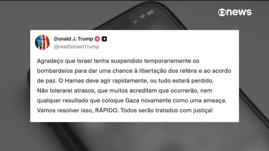 Trump publica mensagem pressionando o Hamas a avançar no acordo parcial de paz