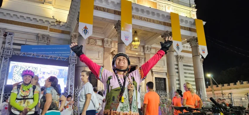 “Mesmo eu não sendo católica, sou espírita, mas eu sinto que o Círio de Nazaré, ele é uma reunião da espiritualidade. Quando a gente fala, quando a gente sente essa energia, a gente se emociona. Mesmo não sendo católica, desde muito tempo eu acredito nesse poder de Maria”. Relata a romeira que vem do município de Castanhal de bicicleta e celebra com muita alegria a conquista de chegar até seu destino final.