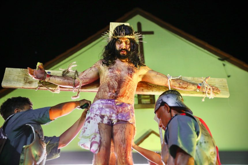 A procissão culminou na Paróquia Nossa Senhora da Paz, onde ocorreu um dos momentos mais aguardados pelos fiéis: a encenação da crucificação e ressurreição de Jesus Cristo.