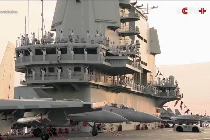 Porta-aviões USS Gerald Ford, da Marinha dos Estados Unidos, em foto de…
