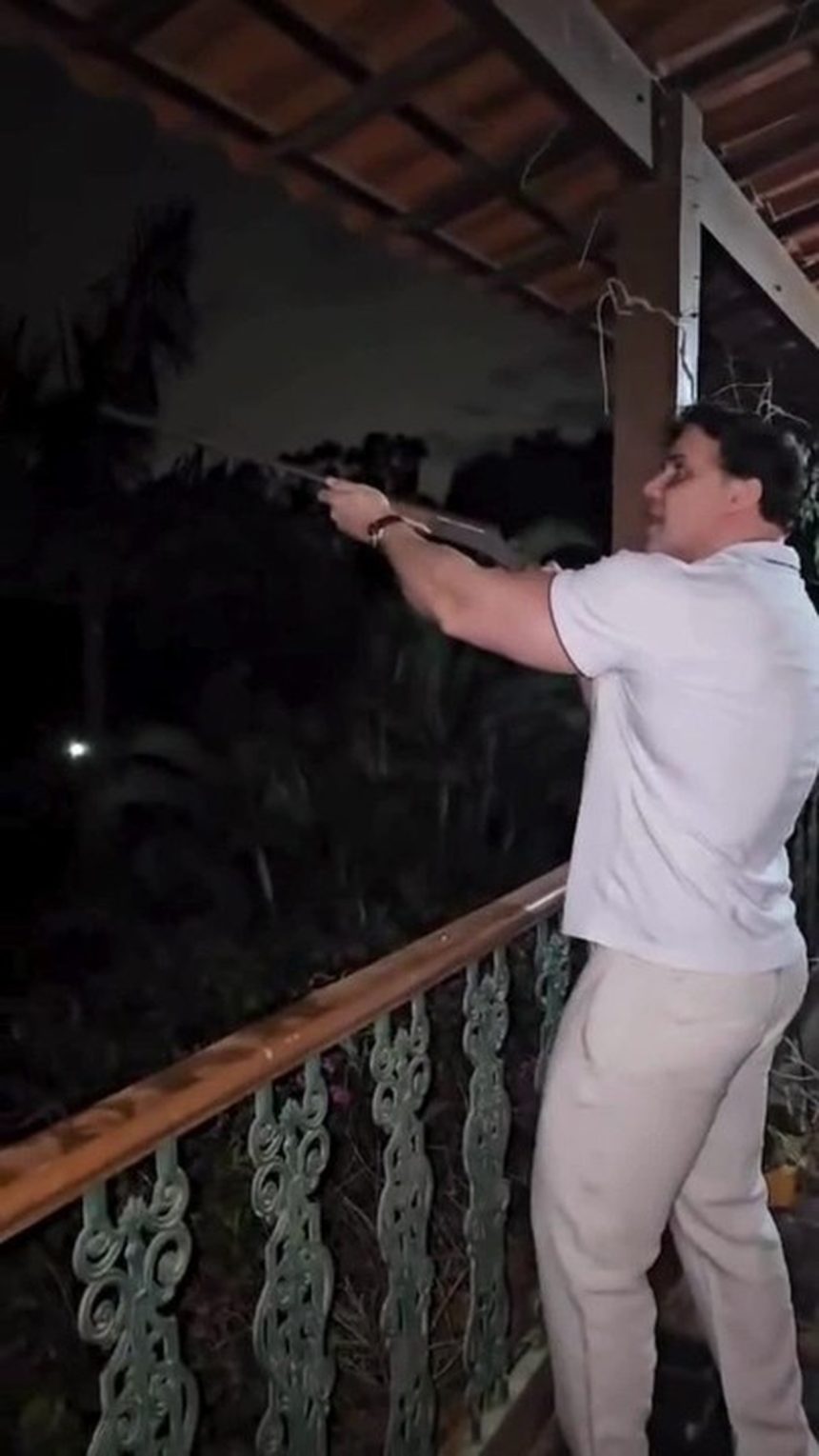 Nas imagens do vídeo acima, cuja data não foi informada, uma pessoa se movimenta por uma casa até uma varanda. Um homem aparece segurando a arma, à noite. “Não vai explodir isso aqui, não? O impacto…”, questiona uma mulher, enquanto o homem segura a arma para fora da varanda. “Isso aí acerta mais de 200 metros”, diz outra mulher. Ao fundo, ouvem-se ruídos que parecem ser fogos.