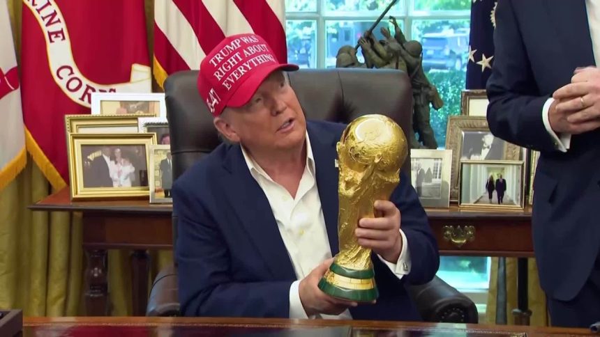 Trump segura taça da Copa do Mundo e pergunta se pode ficar com ela